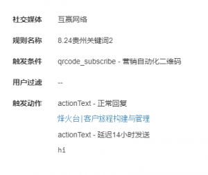 1. 为扫描微信二维码并关注公众号的粉丝推送一条消息,这个场景就只需“简单单线程自动化”,在烽火台的场景应用里:设定触发条件:扫描微信二维码,然后设定触发动作:回复图文消息(实时或延迟)。当然,微信公众平台也支持,扫描回复,不过就是没有延迟回复,只能回复一次。