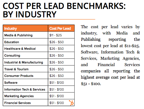 媒体和出版业的报告显示,每条线索的成本最低,在11美元至25美元之间。软件、信息技术和服务、营销机构和金融服务公司的平均成本最高,都在51美元至100美元之间。