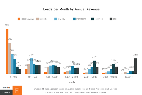 我们发现58%的公司每月产生500条或更少的线索,71%的公司每月产生1000条或更少的线索。然而,正如我们之前看到的,那些最成功的公司也是那些产生最多线索的公司。