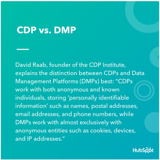 CDP和DMP之间的区别最好的解释:“CDP存储匿名的和已知的个人信息,储存的个人身份信息包括如姓名、邮政地址、电子邮件地址、电话号码以及微信OpenID等,而DMP几乎完全存储匿名的客户信息,如Cookie,设备ID,和网络IP地址等”。