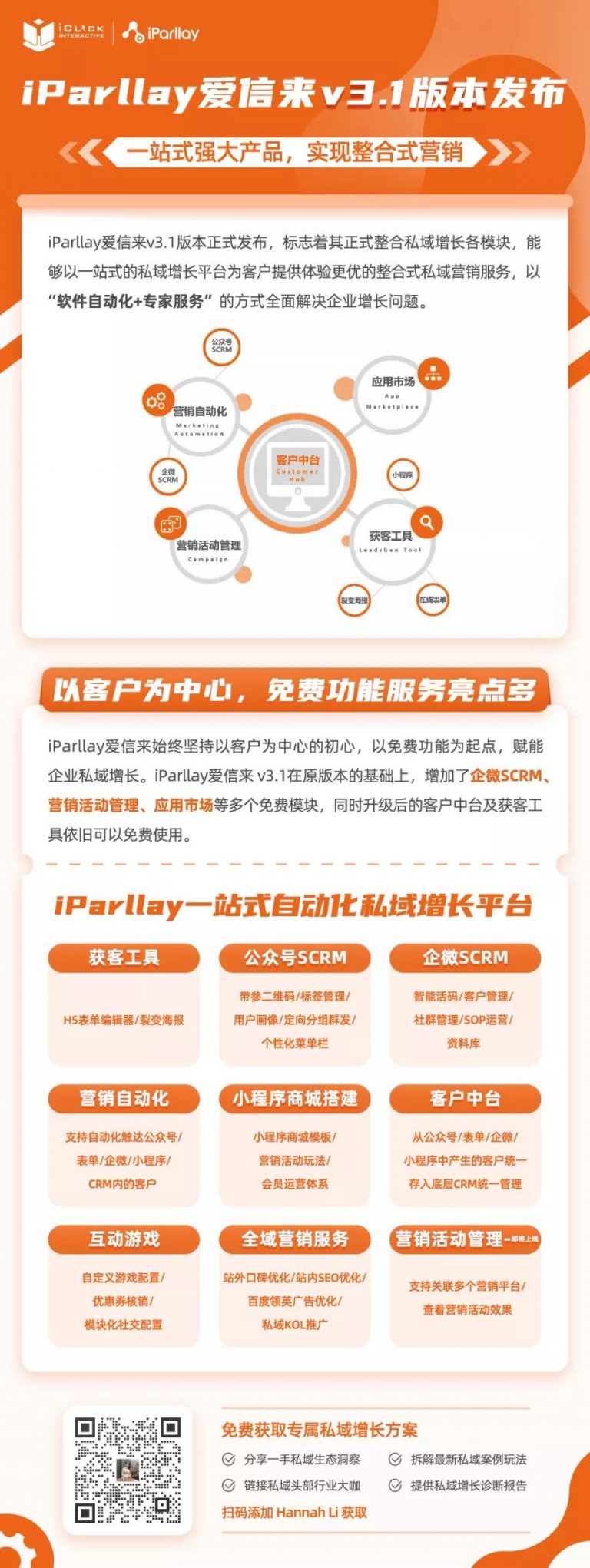 【重磅】iParllay爱信来v3.1版本正式发布 10月 15, 2021 Prev上一篇爱点击·iParllay爱信来成为金投赏官方使用的营销自动化产品 下一篇爱点击携手TO B CGO,联名首发《爱点击•iParllay 私域增长实战白皮书》Next 热门文章 微信公众号数据分析最重要的是什么? 微信公众平台微信小店功能介绍 微信公众号和微信个人号的区别 微信公众平台客服功能使用常见问题 你需要CRM的7个理由 微信公众号如何与企业已有的CRM系统对接? 资料下载 全球营销云解读 白皮书 热门标签微信CRM