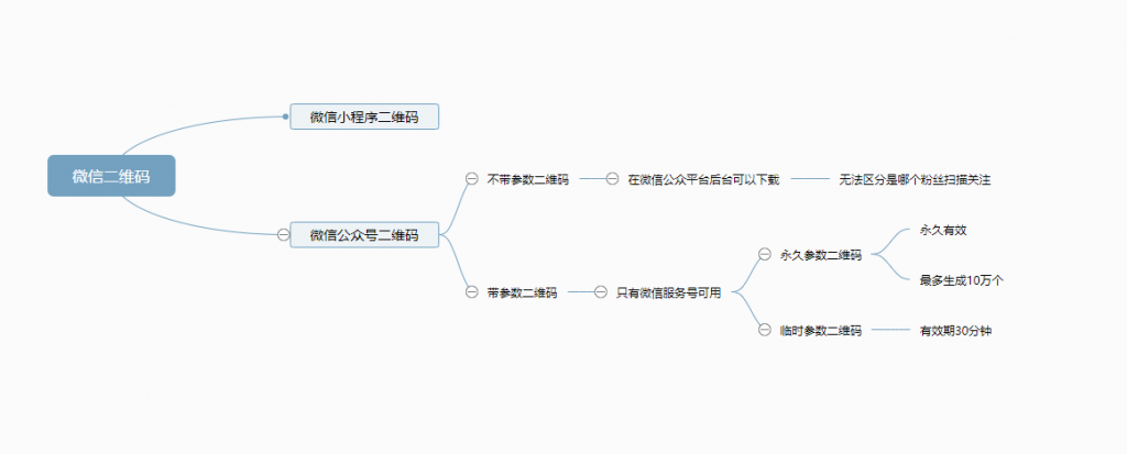 而微信公众号二维码,又分为不带参数二维码和带参数二维码,前者就是大家在微信公众平台上下载下来的,不同尺寸供选择;而后者则是针对微信服务号特有的,根据二维码有效周期不同,又可以分为临时参数二维码和永久参数二维码(见下图)