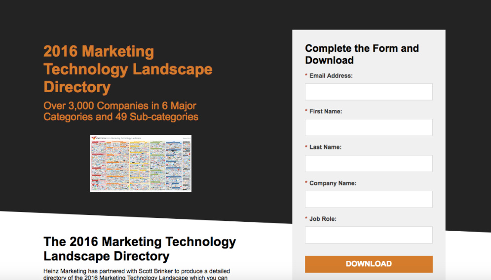编译一个有价值的电子表单会花费很长时间,所以当别人为你做这件事时,你很容易看到它的价值。亨氏营销公司创建了一个易于参考的电子表格目录(营销技术的地图),并将其提供给用户,作为选择加入的回报。