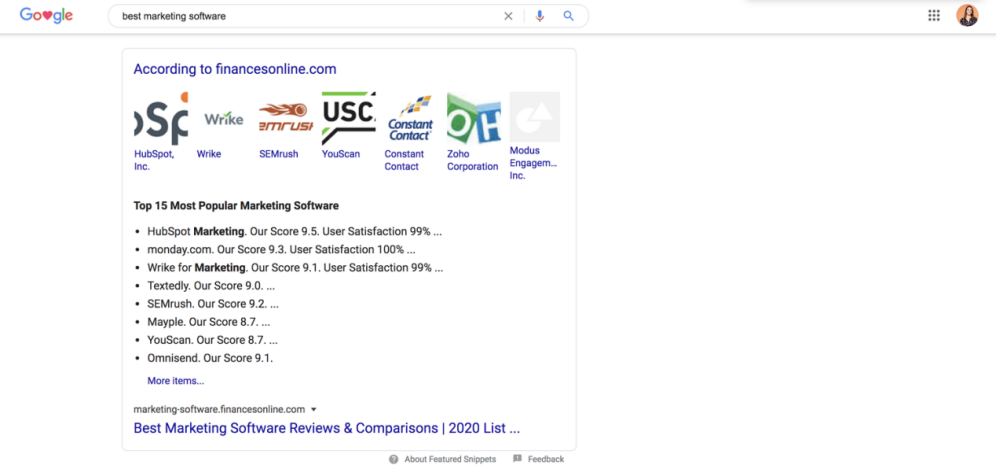 例如,当我搜索“最佳营销软件”时,屏幕会出现FinancesOnline.com,这是一家领先的B2B第三方评论平台。