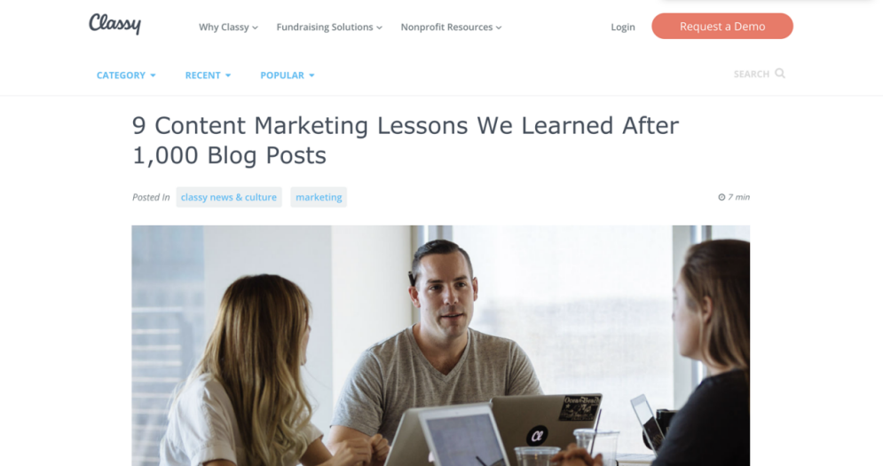 这篇来自Classy的博客文章,一个为非营利组织募集资金的平台,揭开了它与更广泛的内容社区分享的学习经验。它对任何行业的博客都是有帮助的,并鼓励读者下载战略指南作为行动召唤(CTA)。