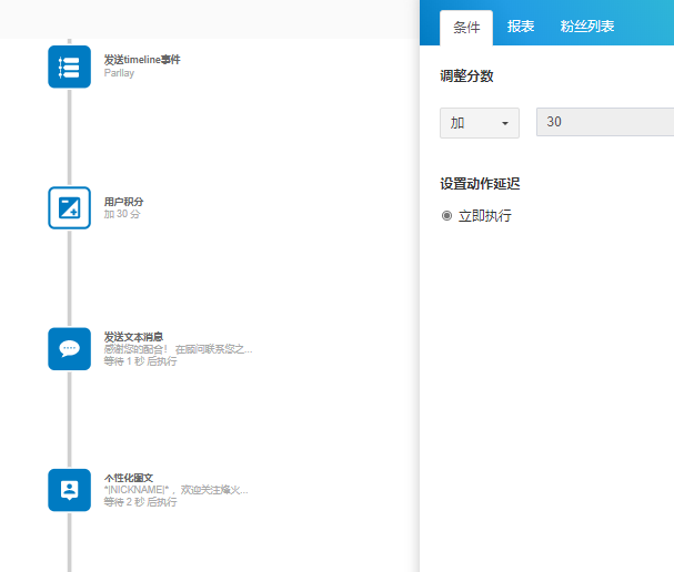 烽火台-微信营销自动化则提供了一套基于微信用户行为的追踪和打分能力,简单说,企业只需要在烽火台工作流中,选择不同旅程中的目标粉丝,并给出相应的分数,烽火台就会自动对符合标准的粉丝打分(增加或减少分数)。