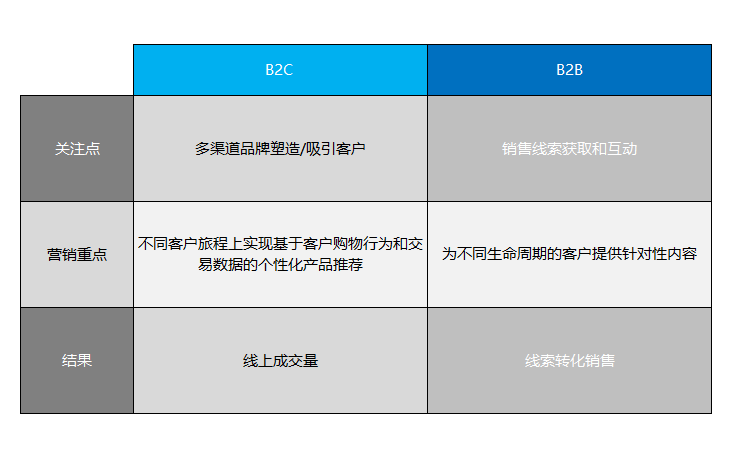 最后,用一张表格来帮助大家快速对比B2B和B2C企业使用营销自动化的不同: