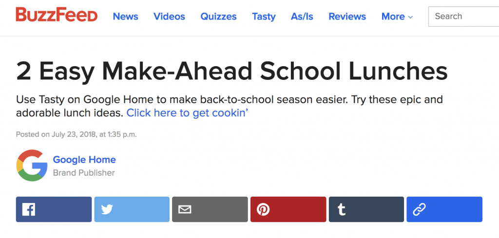 例如,Buzzfeed是一个很受欢迎的出版物和博客,经常与品牌合作进行原生广告。谷歌Home发布了返校食谱的内容,唯一提到这个品牌的是署名。谷歌Home通过将其品牌融入本地内容来宣传其产品。
