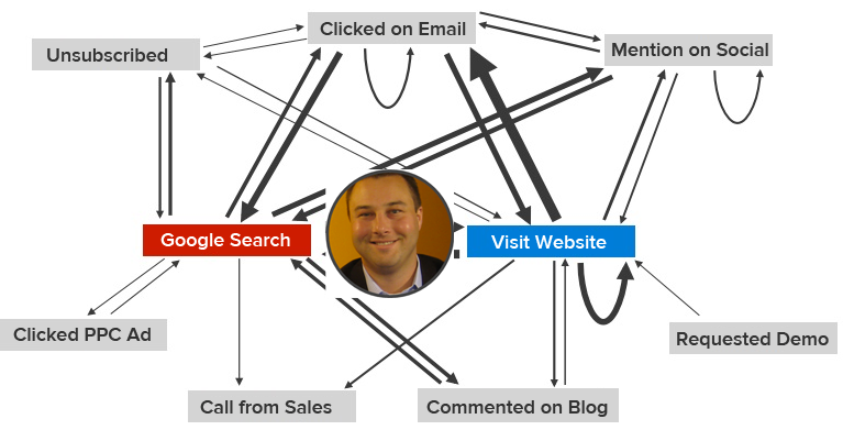 这个工作流,看起来合乎逻辑,你在建立一条影响力之路。但现实中,您的潜在客户不会通过分支活动横向移动。相反,他们的旅程看起来更像这样: