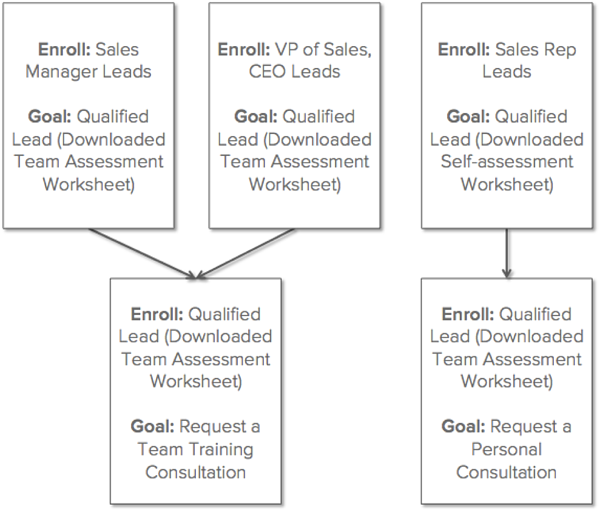 请注意,这些联系是按其角色划分的,并且在达成协商之前提供了一个中介目标。这是为了确保联系人根据他们的角色和他们在买家旅途中的位置,尽可能获得最定制的一系列消息。在这种情况下,对自我评估不感兴趣的联系人不太可能愿意会面进行咨询。
