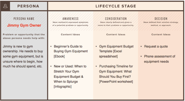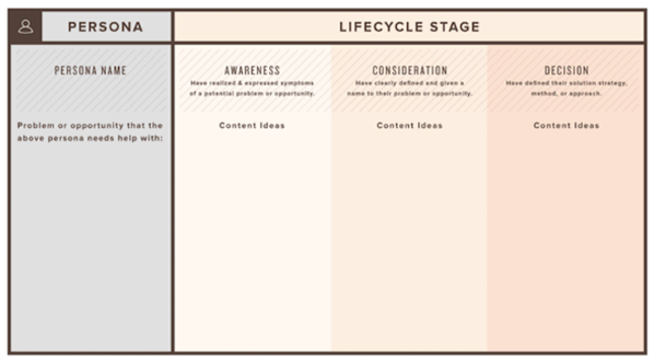 您网站上的可下载内容应属于上述类别之一。确定内容属于哪个阶段是更好地规划更有效工作流的第一步。您可以使用如下所示的模板按阶段组织每个角色的内容。