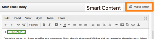 智能内容:根据我们对收件人的了解进行更改的电子邮件或“呼叫到行动”按钮的替代版本。对于exmaple,您在某个行业的联系人可以看到与其他行业不同版本的call-to-action按钮或电子邮件。要做到这一点,请插入一个智能呼叫行动或寻找“使智能”链接在您的电子邮件:
