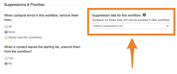 建议您的抑制列表是一个智能列表,以便当新用户加入该列表时,他们将从工作流中删除(类似于他们加入目标列表时的情况)。也就是说,你的目标清单和你的目标清单不一样,这一点非常重要。如果发生这种情况,人们将被压制之前,他们将被承认加入了目标列表和您的转换将是0%。