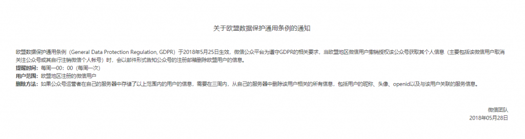欧盟数据保护通用条例(General Data Protection Regulation, GDPR)于2018年5月25日生效,微信公众平台为遵守GDPR的相关要求,当欧盟地区微信用户撤销授权该公众号获取其个人信息(主要包括该微信用户取消关注公众号或其自行注销微信个人帐号)时,会以邮件形式告知公众号的注册邮箱删除欧盟用户的信息。