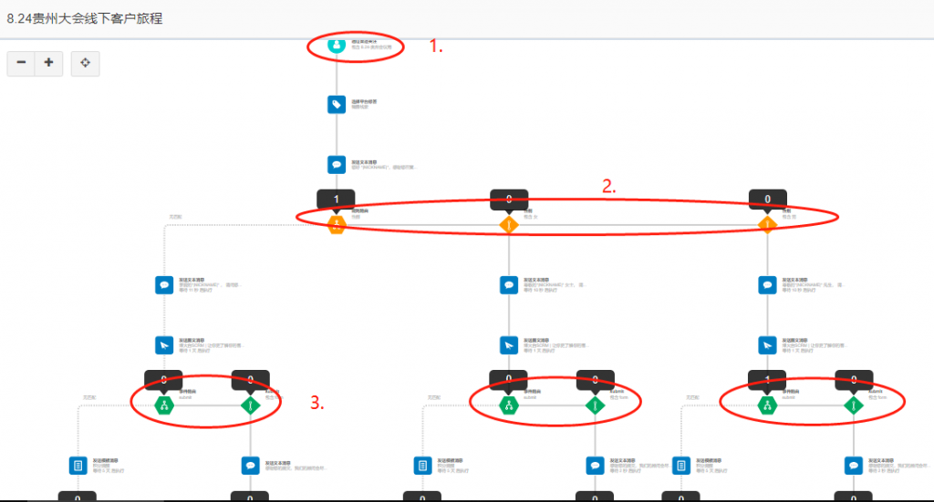 举例说明:下图是客户常见场景之一,便是用最基础的工作流设置而成。那么图中工作流设置的是什么意思呢?