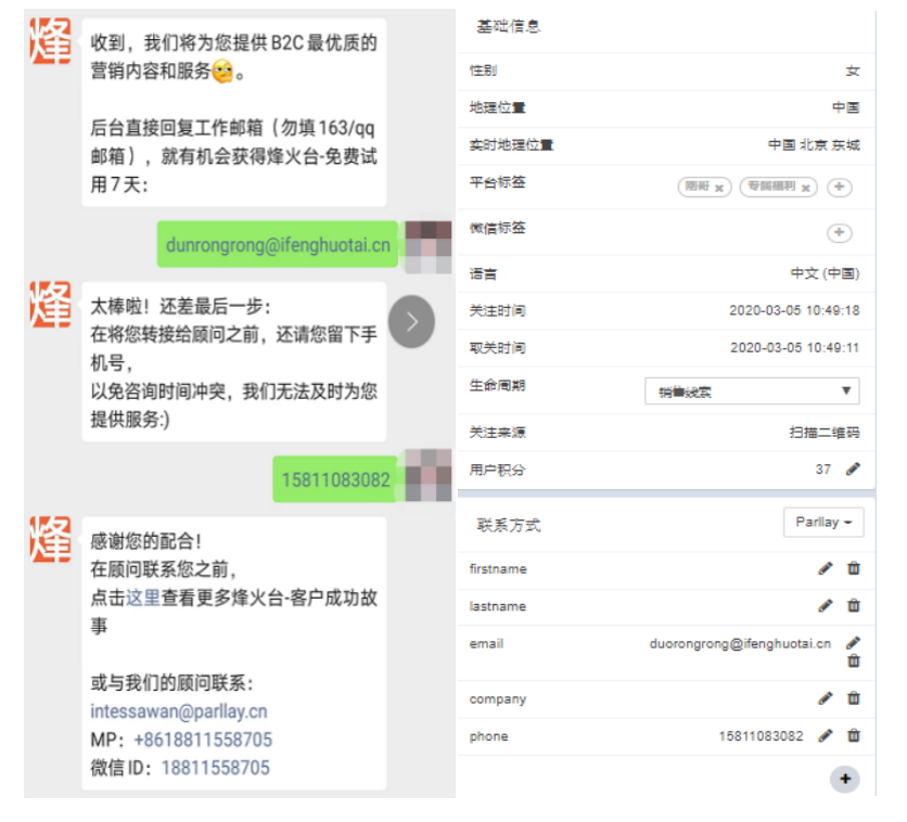 烽火台-营销自动化还提供一种更为简便的方式——在正确的时间,向正确的粉丝,直接询问粉丝的联系方式: