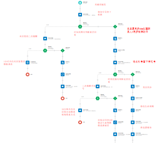 至于如何在正确的时间,向正确的粉丝进行留下联系方式的引导,这是通过烽火台-营销自动化引擎——工作流,基于不同的场景下所互动流程,再结合明智的营销策略和话术,来实现的: